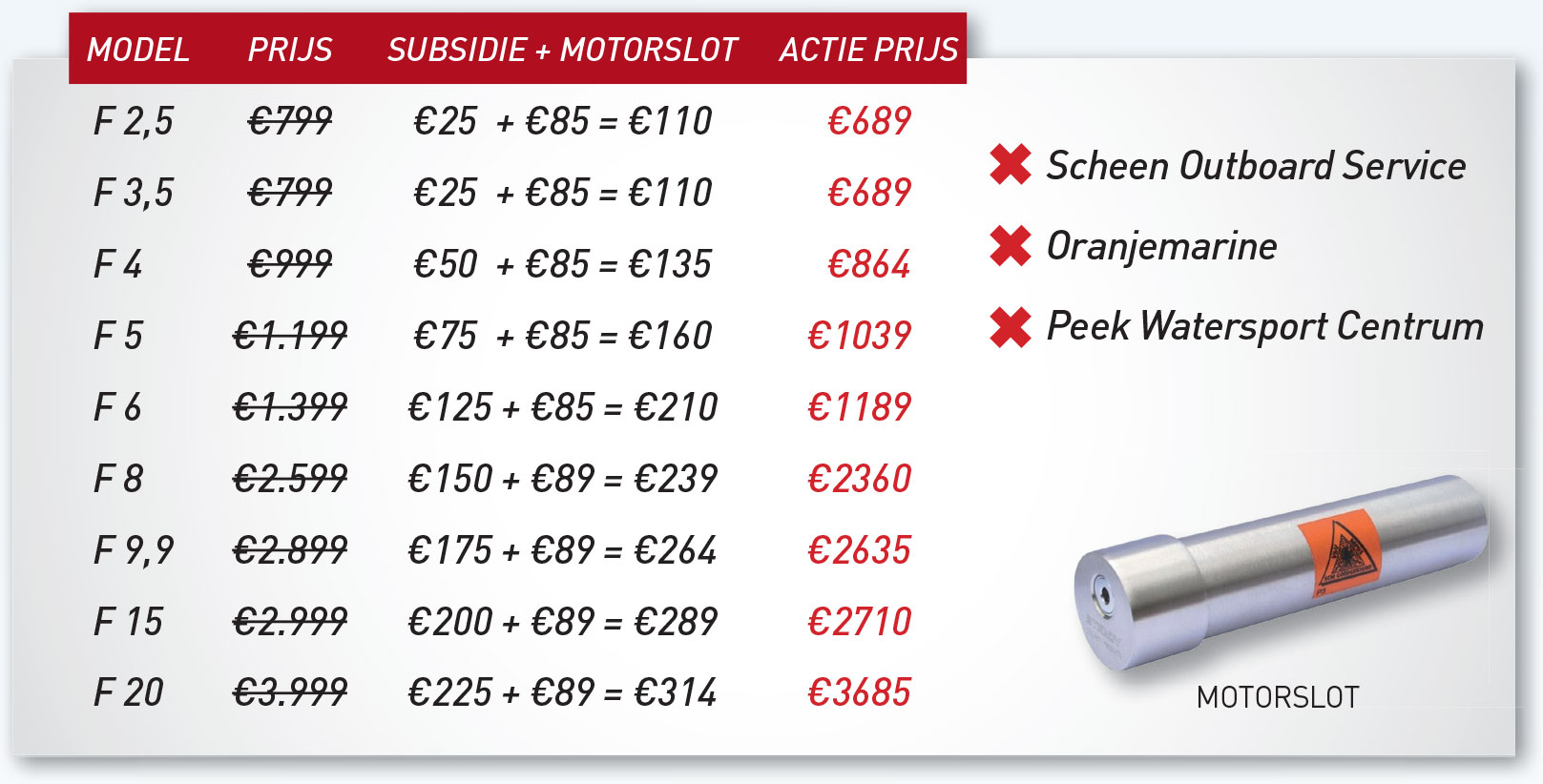 Het is vanaf 1 januari 2017 niet meer toegestaan om in Amsterdam te varen met een tweetakt buitenboordmotor. Onderstaande Mercury dealers geven u tot 1 juli 2017 een zeer aantrekkelijke Amsterdamse milieu subsidie plus motorslot bij het inruilen van uw oude tweetakt buitenboordmotor.